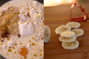 Corta el segundo plátano en rodajas y después da forma con un molde corazón, si no tienes, puedes dejar las rodajas.