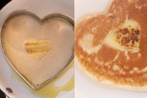 Para que tus pancakes o tortitas tengan un corazón perfecto debes ayudarte de un molde y sumergir antes los bordes en aceite de oliva o mantequilla, de esta manera te resultará mucho más fácil retirarlo a la hora de darle la vuelta.