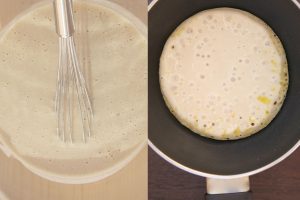 En una sartén pequeña antiadherente pon una perlita de mantequilla y vierte un cucharón de la masa de tortitas.