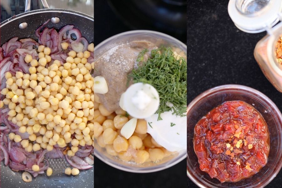 En una sartén pon una fina cama de aceite de oliva y rehoga la cebolla roja y los ajos cortados en láminas. (reserva algunos pétalos de cebolla para añadirla en crudo).Cuando empiece a oler rico añade las semillas de comino y deja que se tuesten, seguidamente fríe el pimentón y mezcla para que todos los sabores se fusionen. Después vuelca los garbanzos, añade una pizca de canela en polvo, sazona al gusto y cocina todo junto hasta que algunos de los garbanzos se tornen dorados y a algunos de ellos les cubra una fina capa crujiente.